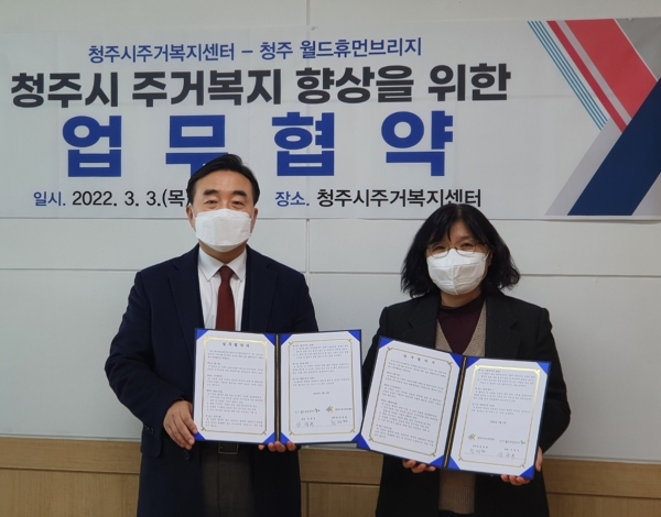 [충청뉴스큐] 청주시주거복지센터는 3일 국제구호개발NGO인 청주월드휴먼브릿지와 청주시 주거복지 향상을 위한 업무협약을 체결했다.