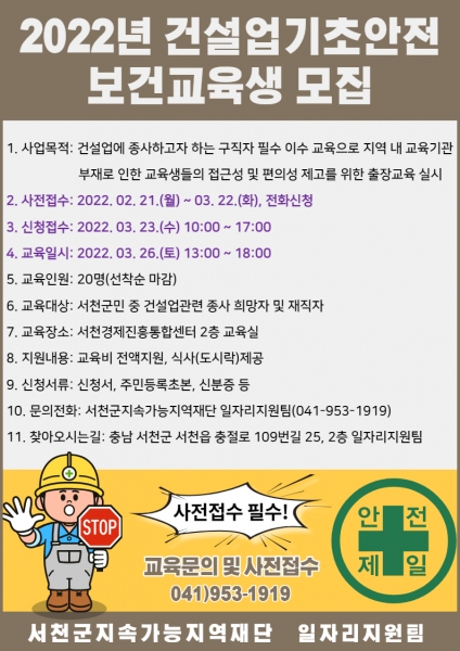 [충청뉴스큐] 서천군지속가능지역재단이 지난해 취약계층을 대상으로 실시한 건설업기초안전보건교육 이수증 취득과정이 지역민의 큰 호응에 힘입어 오는 3월26일 추가 교육을 실시한다고 밝혔다.