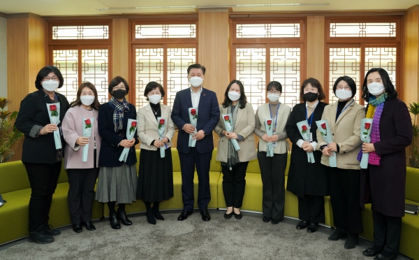 이날 간담회에서 구만섭 권한대행은 여성 공직자들에게 참정권을 의미하는 장미 한 송이를 전달했다.
