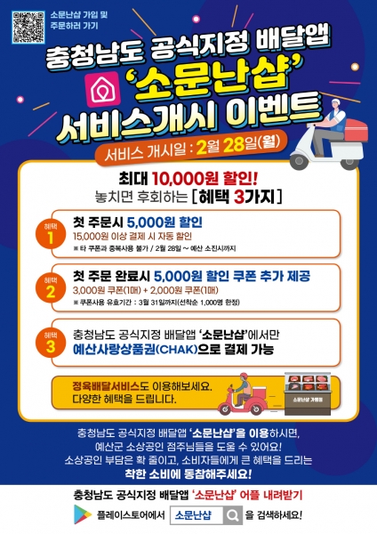 [충청뉴스큐] 예산군은 지역 화폐 사용이 가능한 충청남도 공식지정 배달 앱 ‘소문난 샵’ 서비스를 본격 개시했다.