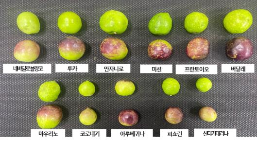 과중 기준 오일 함량 10% 이상 품종은 ‘코로네키‘, ‘프란토이오‘, ‘루카‘, ‘버달레‘이고 그 중 ‘코로네키‘ 품종이 12.2∼12.4%로 가장 많았다.
