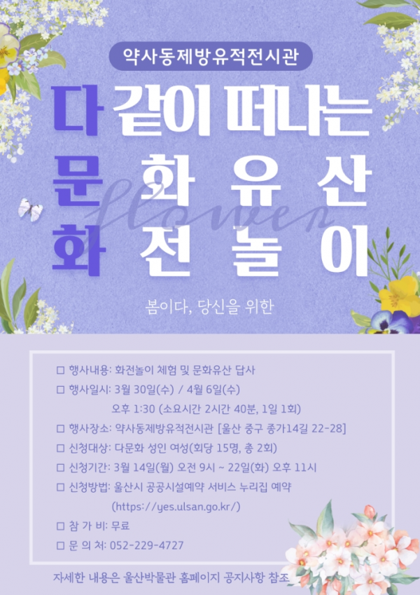 [충청뉴스큐] 울산박물관 산하 약사동제방유적전시관은 다문화 교육 프로그램 ‘다 같이 떠나는 문화유산 화전놀이’의 참가자를 모집한다고 밝혔다.