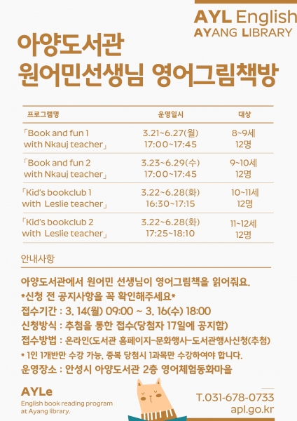[충청뉴스큐] 안성시 아양도서관에서는 초등학생을 대상으로 ‘AYL잉글리시-원어민선생님 영어그림책방’ 참여자를 모집한다.