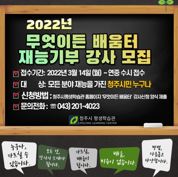 [충청뉴스큐] 청주시평생학습관이 시민 누구나 자신이 가진 지식과 재능을 공유할 수 있는 ‘무엇이든 배움터’ 강사를 3월 14일부터 상시 연중 모집한다.