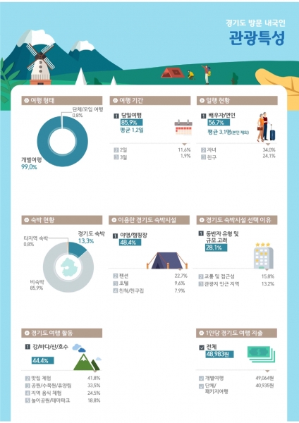 또 경기도를 방문한 내국인 관광객 대부분이 단체나 모임여행보다는 개별여행의 형태로 당일여행을 즐긴 것으로 드러났다.
