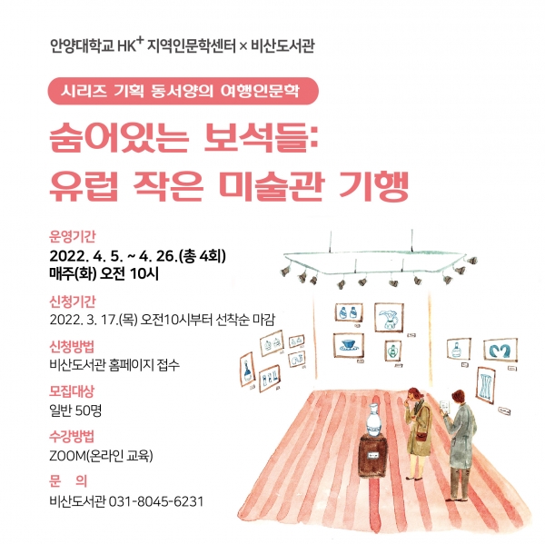 [충청뉴스큐] 안양시 비산도서관에서는 오는 4월 5일부터 26일까지‘숨어있는 보석들: 유럽 작은 미술관 기행’인문강좌를 운영한다.