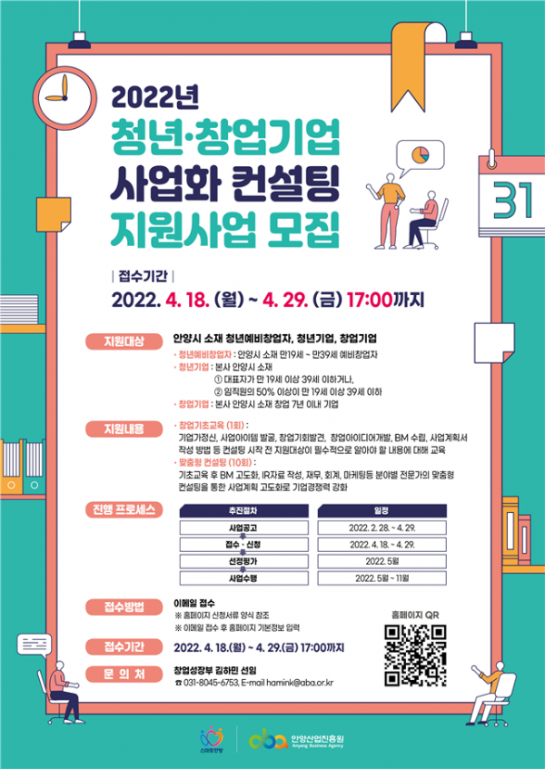 해당 사업 신청접수는 4월 18일부터 4월 29일까지 진행되며 신청 및 기타 자세한 사항은 안양산업진흥원 홈페이지를 통해 확인할 수 있다.