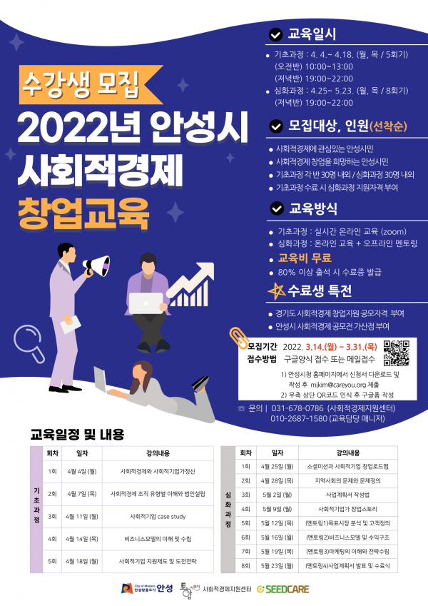 [충청뉴스큐] 안성시는 오는 3월 31일까지 ‘2022년 사회적경제 창업교육’에 참여할 수강생을 모집한다.
