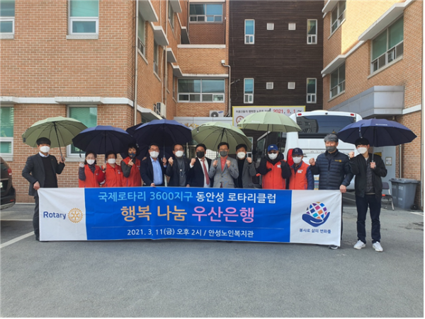 [충청뉴스큐] 대한불교조계종사회복지재단 안성시노인복지관은 지난 11일 국제로타리 3600지구 동안성로타리클럽과 ‘행복나눔 우산은행’ 전달식을 가졌다고 밝혔다.