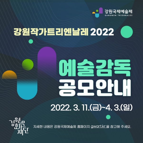 [충청뉴스큐] 강원문화재단 강원국제예술제운영실은 ‘강원작가트리엔날레2022’를 이끌어 갈 역량 있는 예술감독을 공개 모집한다.