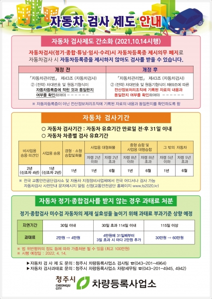[충청뉴스큐] 청주시는 지난 2021월 10일 14. 개정 시행된 ‘자동차관리법’에 따라 자동차 검사 시 자동차등록증 제출 의무가 폐지됐다고 밝혔다.