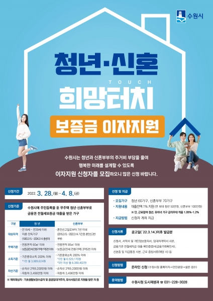 수원시의 ‘청년·신혼 희망터치 보증금 이자지원’은 수원시에 주민등록을 둔 무주택자 중 금융권에서 전월세보증금 대출을 받은 만 18~39세 청년, 혼인신고일로부터 7년 이내인 부부에게 대출잔액의 1% 이자를 지원하는 사업이다.