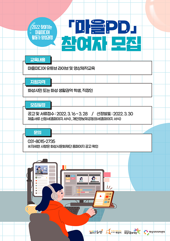 [충청뉴스큐] 화성시문화재단 화성시미디어센터는 전년도에 이어 2022년도 상반기 마을미디어 활동가 양성과정 ‘마을PD’를 모집한다고 밝혔다.