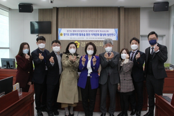 [충청뉴스큐] 경기도의회 연구단체 ‘경기도 평화시대 발전포럼’은 3.16 교육기획위원회 회의실에서 ‘경기도 문화자원 활용을 통한 지역문화 활성화 방안 연구’에 대한 연구용역 착수보고회를 개최했다.
