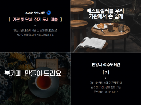 안양시 기관 및 단체 내에 작은 북카페를 만들 공간만 있다면 신청이 가능하며 대출 도서는 자관의 특성에 맞는 도서로 구성이 가능하다.
