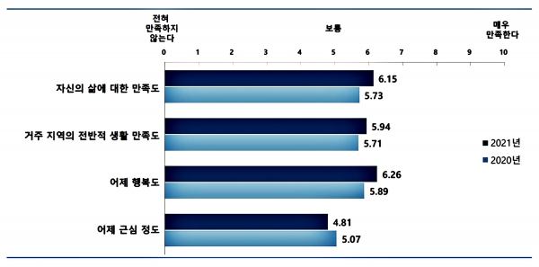 17일 ‘2021 충주시 사회조사’ 실시 결과에 따르면 올해 시민이 생각하는 삶의 만족도는 10점 만점에 6.15점으로 코로나19 상황에도 불구하고 지난해에 비해 소폭 상승했다.
