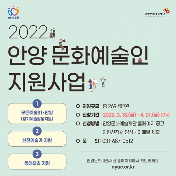 지원신청서 접수는 안양문화예술재단 홈페이지에서 신청서를 다운받아 작성 후 4월 1일 오후 5시까지 이메일로 접수하면 된다.