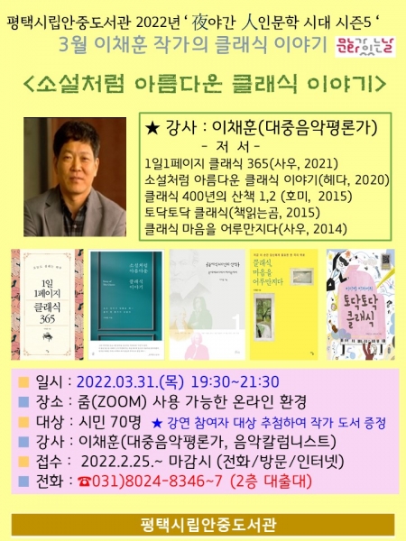 [충청뉴스큐] 평택시 안중도서관은 2022년 3월 야간인문학 이채훈 작가의 클래식 강연 ‘소설처럼 아름다운 클래식 이야기’를 운영한다고 밝혔다.