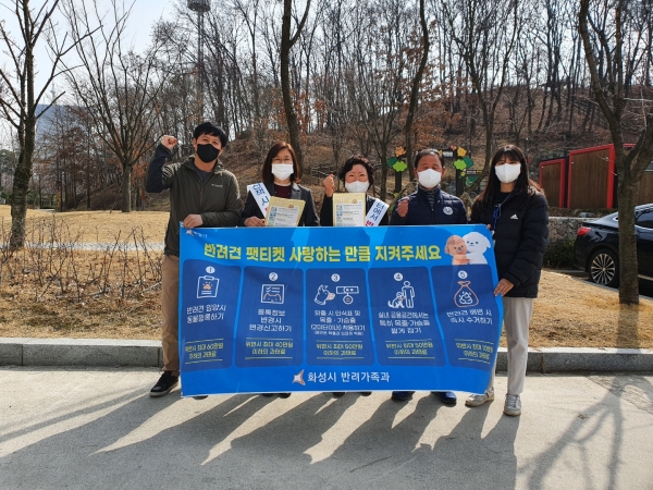 [충청뉴스큐] 화성시가 16일 여울공원과 호수공원, 센트럴파크 일대에서 명예감시원과 함께 펫티켓 준수 캠페인을 벌였다.