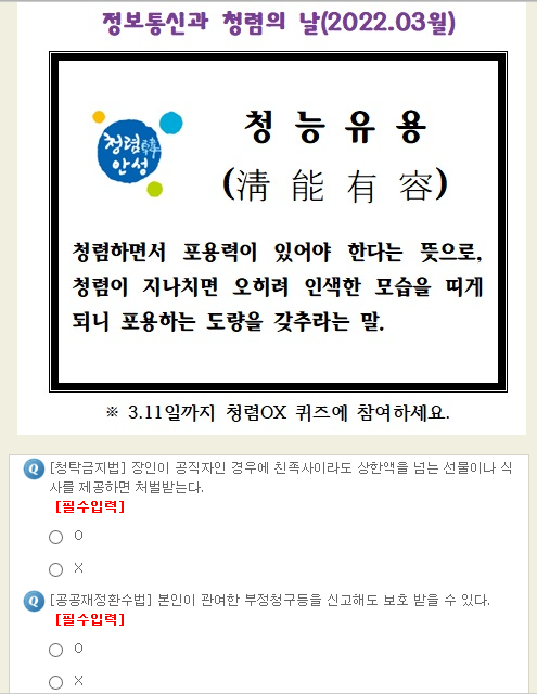 [충청뉴스큐] 안성시 정보통신과는 생활 속 청렴 문화 조성을 위해 매월 첫 번째 월요일을 ‘정보통신과 청렴의 날’로 지정해 운영할 계획이라고 밝혔다.