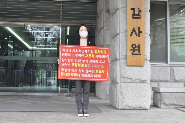 이에 2022년 3월 17일 감사원을 찾은 박연숙 의원이 정치권 로비에 휘둘리지 말고 공직자의 본연의 입장에서 조사를 철저히 하라는 1인 시위에 나섰다.