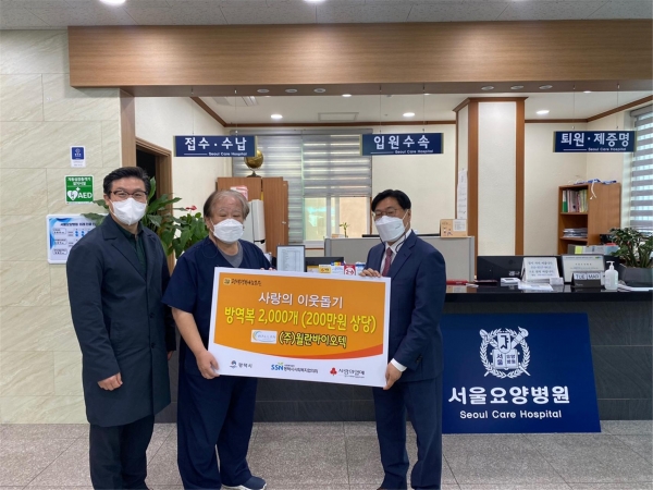 [충청뉴스큐] ㈜월란바이오텍은 지난 15일 서울요양병원에 200만원 상당의 방역복 2,000개를 전달했다.