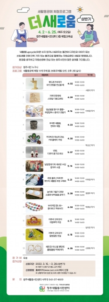 총 30개 주제로 7명의 작가가 참여하는 이번 프로그램은 4. 2.부터 6. 25.까지 매주 토요일에 청주새활용시민센터 3층 체험교육실에서 주제별로 오전, 오후 2회 진행될 예정이다.