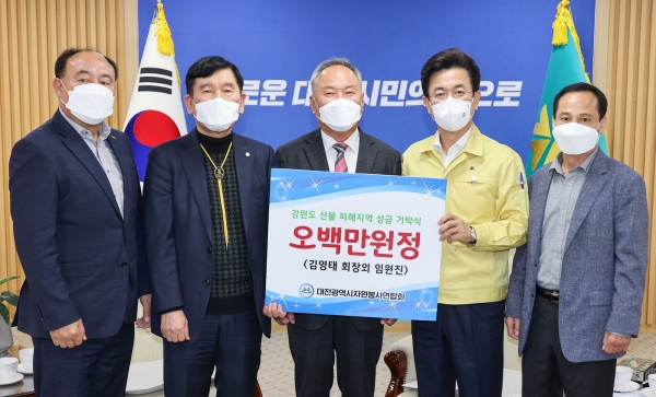 기탁식에 함께한 허태정 대전시장은 “보태주신 성금은 산불로 소중한 보금자리를 잃고 슬픔에 잠겨있는 울진 피해지역 이재민의 복구에 활용될 수 있도록 잘 전달하겠다”며 감사의 뜻을 전했다.