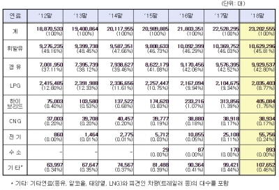 2018년도 연료 종류별 자동차의 등록 현황을 살펴보면, 휘발유와 LPG차량은 등록 대수가 각각 1,063만 대, 204만 대로 점유율은 지속해서 소폭으로 감소하는 추세이고, 경유차는 등록 대수가 993만 대로, 증가세가 둔화 되고 있는 것으로 나타났다.
