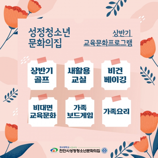 성정청소년문화의집 상반기 프로그램은 이달부터 오는 6월까지 관내 청소년과 가족을 대상으로 무브 온 새활용교실 비건 베이킹 비대면 교육문화 가족 보드게임 가족 요리 등 다양한 프로그램을 제공한다.