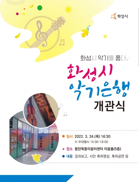 [충청뉴스큐] 화성시인재육성재단 동탄목동이음터센터는 오는 3월 24일 오후 3시부터 화성시 악기은행 개관식을 개최한다고 밝혔다.