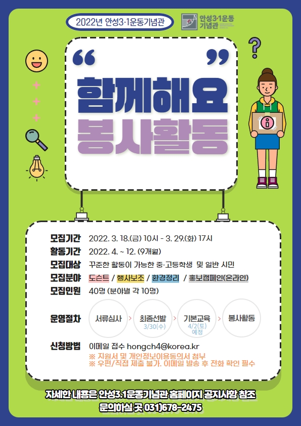 이번 자원봉사는 기념관에 관심을 갖고 꾸준한 활동을 할 수 있는 중·고등학생 및 일반 시민이라면 누구나 신청할 수 있으며 안성의 역사와 문화를 관람객에게 알릴 수 있는 의미 있는 기회가 될 것이다.