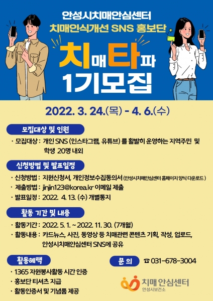 안성시보건소 관계자는 “SNS가 주요한 홍보수단으로 자리잡고 있는 시대적 흐름에 따라 다양한 치매 관련 정보 전달방법이 요구되고 있다”며 “무엇보다 주민 참여형 치매인식 개선활동이라는 데에 큰 의미가 있는 이번 SNS 홍보단 모집에 많은 관심과 동참을 바란다”고 전했다.