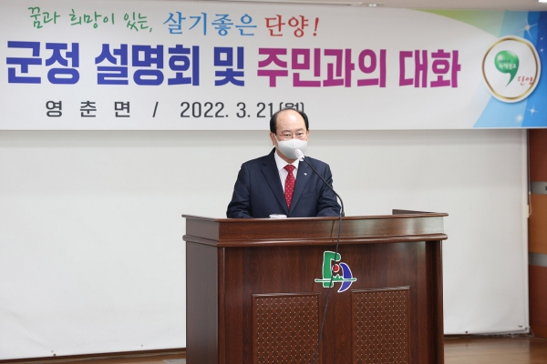 코로나19 여파로 3년 만에 추진되는 군정 설명회는 지난 21일 영춘면과 가곡면을 시작으로 22일 단성·대강면, 23일 적성면, 24일 매포읍, 25일 어상천면, 28일 단양읍 등 8개 읍·면을 순회하며 6일간 진행된다.