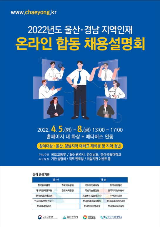 [충청뉴스큐] 울산시는 ‘2022년 울산·경남혁신도시 이전공공기관 지역인재 합동채용설명회’를 오는 4월 5일부터 4월 8일까지 온라인으로 개최한다고 밝혔다.