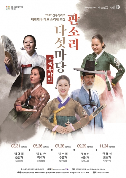 [충청뉴스큐] 대전시립연정국악원이 TJB대전방송과 공동주최로 2022전통시리즈 대한민국 대표 소리제 초청‘판소리 다섯 마당, 오색 유파 전’을 오는 3월 31부터 11월 24일까지 진행한다고 밝혔다.