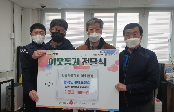 [충청뉴스큐] 안성시 원곡면게이트볼회는 지난 22일 강원도 산불로 피해를 입은 이재민을 돕기 위해 의연금 100만원을 원곡면에 전달했다.