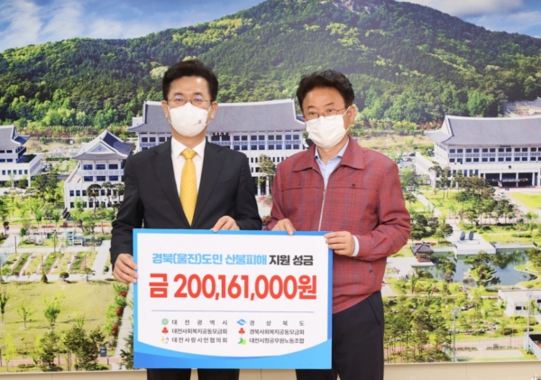 대전시는 허태정 대전시장과 정태희 대전사회복지공동모금회장, 조광휘 대전사랑시민협의회장, 김성용 대전시공무원노조위원장 등 지역대표 4명이 23일 오전 9시 경북도청을 방문해 이철우 경북도지사에게 2억 여만원의 성금과 이츠수 5천 병을 전달했다고 밝혔다.