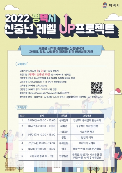 [충청뉴스큐] 평택시는 오는 24일부터 은퇴 후 새로운 시작을 준비하는 신중년에게 인생설계 지원을 위한 ‘2022년 평택시 신중년 레벨UP 프로젝트’수강생을 모집한다.