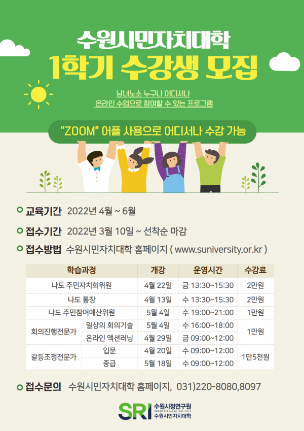 [충청뉴스큐] 수원시정연구원에서 운영하는 수원시민자치대학이 1학기 수강생을 선착순 모집 중이다.