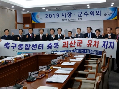 [충청뉴스큐] 이차영 충북 괴산군수가 16일 충북도청 소회의실에서 열린 ‘2019년 충북도 시장·군수회의’에서 대한축구협회가 추진하는 ‘대한민국 축구종합센터’가 괴산군에 유치될 수 있도록 힘을 모아 달라고 요청했다.