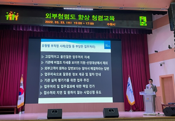 수원시 공직자들이 사용하는 ‘행정포털’에서 실시간으로 중계한 이번 교육은 각종 인허가, 보조금 지급, 공사·용역 관련 업무 등을 담당하는 공직자 600여명을 대상으로 진행했다.