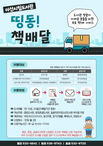 [충청뉴스큐] 아산시립도서관이 3월부터 도서관 접근에 어려움을 겪고 있는 이용자를 위한 ‘띵동 책배달 서비스’를 확대 운영한다.