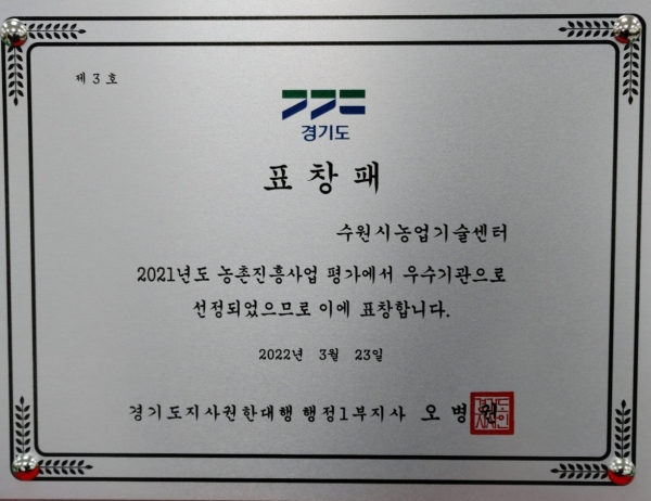 [충청뉴스큐] 수원시농업기술센터가 경기도농업기술원 주관 ‘2021년도 농촌진흥사업 평가’에서 우수기관으로 선정돼 경기도지사 표창을 받았다.
