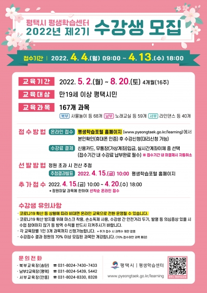 [충청뉴스큐] 평택시 평생학습센터는 시민 누구나 언제 어디서든 배울 수 있는 양질의 다양한 교육프로그램을 제공하기 위해 4월 4일부터 ‘2022년 제2기 정기교육프로그램 수강생 모집’을 실시한다.