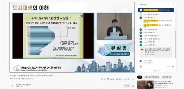 [충청뉴스큐] 예산군 도시재생지원센터는 지난 24일 군민 등 관계자 30여명이 참여한 가운데 제13기 도시재생대학 개강식을 비대면으로 개최했다.