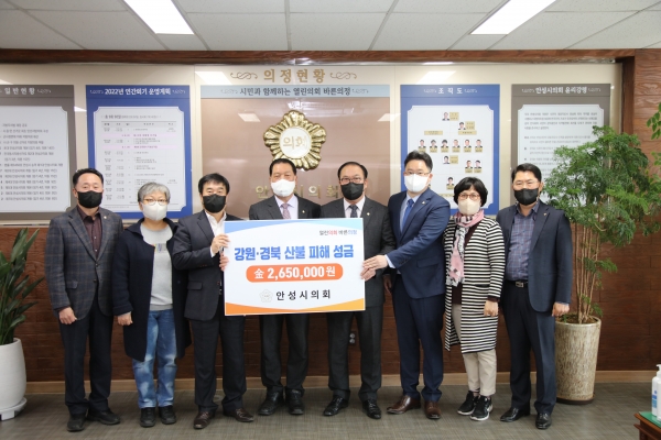 이번 성금은 지난 3월 4일부터 13일까지 경북·강원지역의 대규모 산불로 피해를 입은 경북·강원지역 주민과 지자체의 빠른 피해복구 및 이재민 생활안정을 바라는 마음으로 안성시의회 시의원과 의회사무과 직원들이 자발적으로 참여한 성금에 의장과 부의장의 업무추진비를 보태 마련한 265만을 경기사회복지공동모금회에 전달했다.