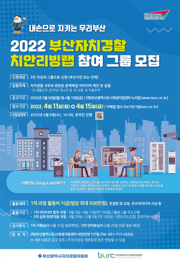 자세한 내용은 부산자치경찰위원회 누리집 또는 부산시도시재생지원센터 누리집을 참고하면 되고 4월 6일에는 온라인 사업설명회가 열릴 예정이다.