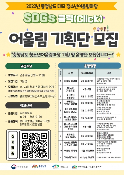 [충청뉴스큐] 천안시태조산청소년수련관이 2022년 충청남도 대표 청소년어울림마당 ‘SDGs 청소년, 클릭’을 운영함에 따라 청소년 소통 창구를 열어줄 ‘어울림 기획단’을 모집한다.