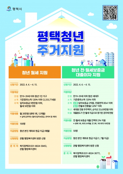 [충청뉴스큐] 평택시는 청년의 주거 안정 및 지역 정착을 돕기 위한 지원정책으로 ‘평택청년 주거지원’사업을 오는 4월 4일부터 15일까지 2주간 거주지 관할 행정복지센터에서 신청을 받을 예정이라고 밝혔다.